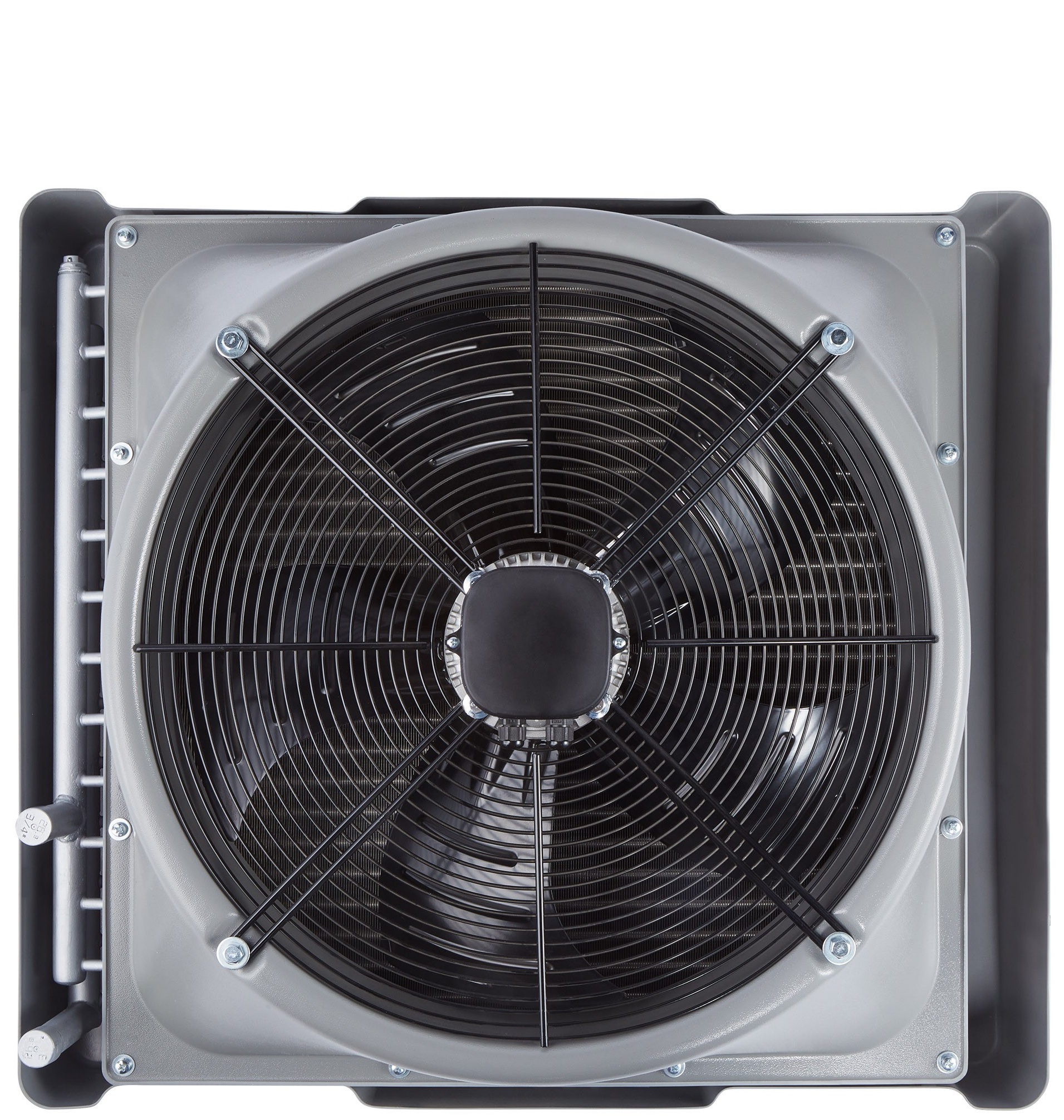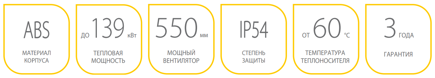 Теплообменник с увеличенным фронтом и рядностью обеспечивает высокую тепловую мощность даже при низкотемпературном теплоносителе. Вентилятор диаметром 550 мм создает мощный воздушный поток с максимальной длиной струи до 30 метров, для равномерного распределения и перемешивания воздуха внутри помещения.
