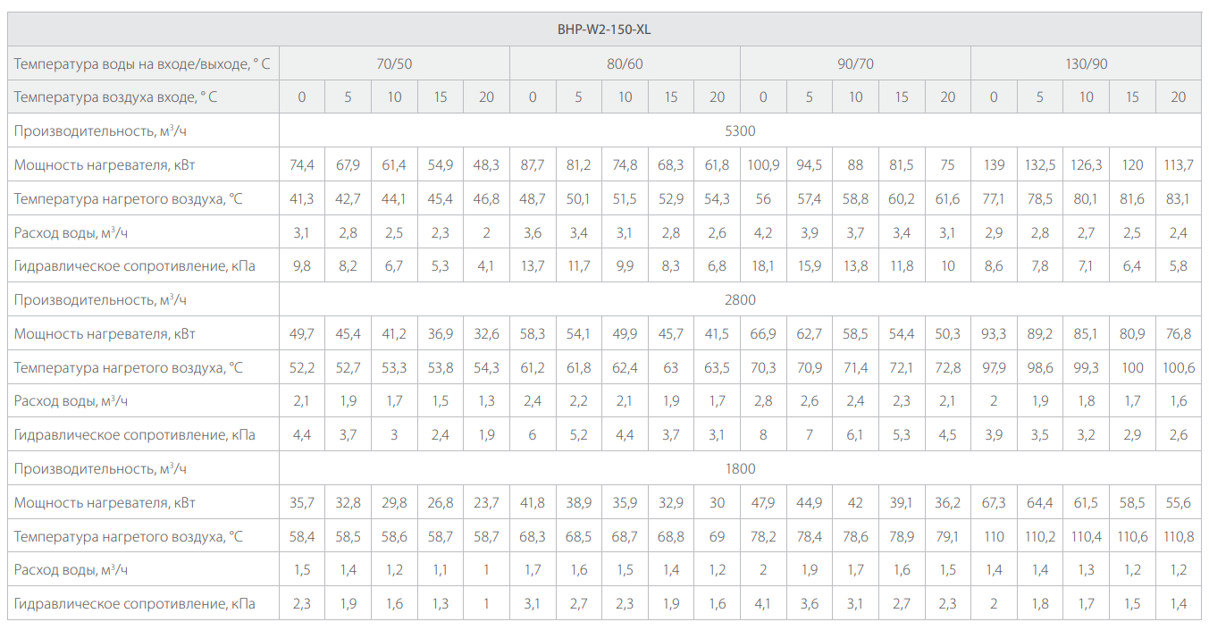 | Параметр / Модель | BHP-W2-110-XL | BHP-W2-130-XL | BHP-W2-150-XL |