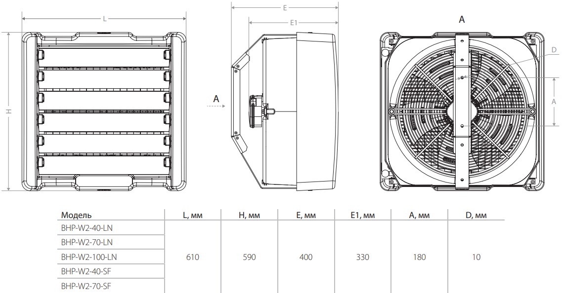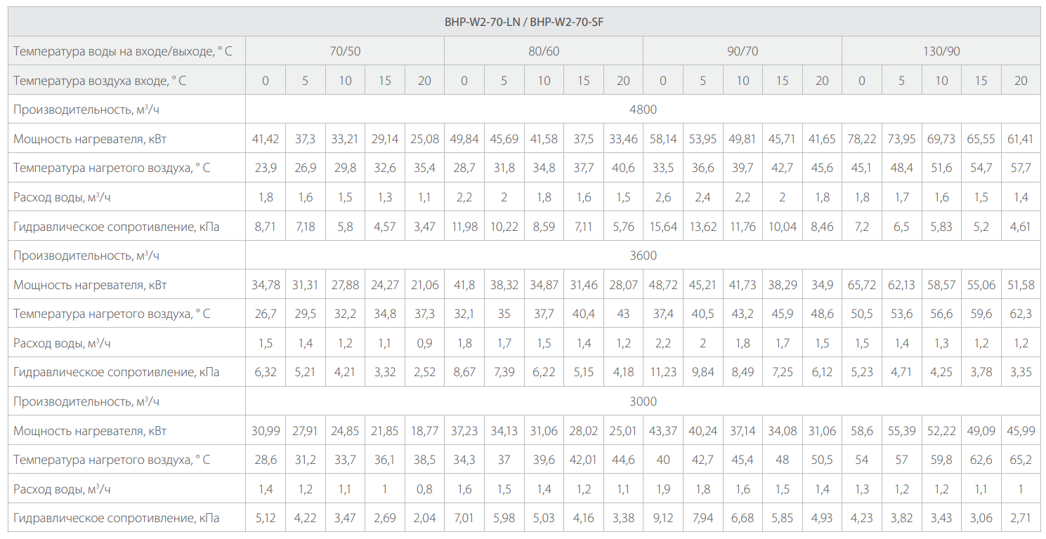 | Параметр / Модель | BHP-W2-40-LN | BHP-W2-40-SF | BHP-W2-70-LN | BHP-W2-70-SF | BHP-W2-100-LN |