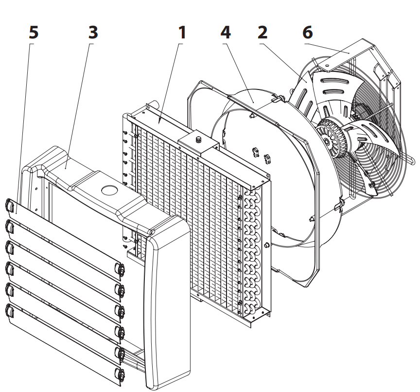 - 5. Направляющие жалюзи формируют направление струи теплого воздуха. Высокая дальность струи воздуха достигается при помощи специального профиля лопаток. Возможна индивидуальная регулировка направляющих.