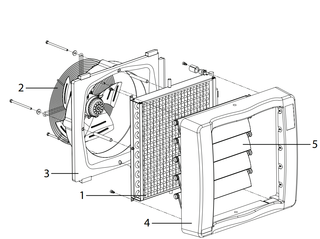 - 1. Однорядный теплообменник: медно-алюминиевая конструкция состоит из медных трубок - змеевика, а также алюминиевых ламелей. Присоединительные патрубки находятся на задней панели корпуса.