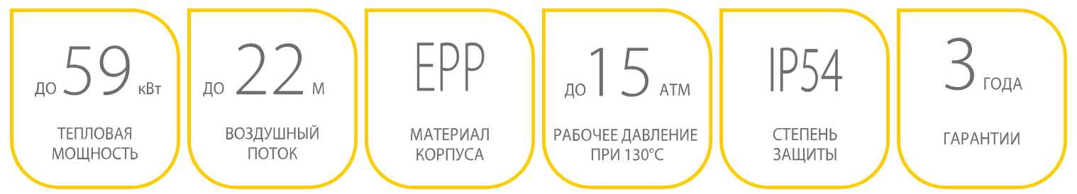 Однорядный медно-алюминиевый теплообменник с увеличенной поверхностью теплоотдачи обеспечивает тепловую мощность до 25,7 кВт. А энергоэффективный трехскоростной двигатель обеспечивает производительность 3200 м³/ч и длину струи теплового воздуха до 15 метров, при этом не требует приобретения дорогостоящей автоматики для регулировки производительности.