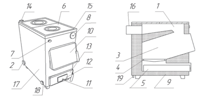 1 - Газоход, 2 - Заглушка отверстия для блока ТЭНов, 3 - Топка, 4 - Колосник, 5 – Зольный ящик, 6 – Плита с конфорками, 7 – Отверстие для установки регулятора тяги, 8 – Термометр, 9 – Водяная рубашка, 10 – Дверца загрузочная, 11 – Ручка регулировки поднятия заслонки, 12 – Заслонка подачи первичного воздуха, 13 – Дверца поддувальная, 14 – Патрубок подачи,15 – Рамка обрамления, 16 – Дымоход, 17 – Корпус котла, 18 – Патрубок обратки, 19 – Болт заземления.