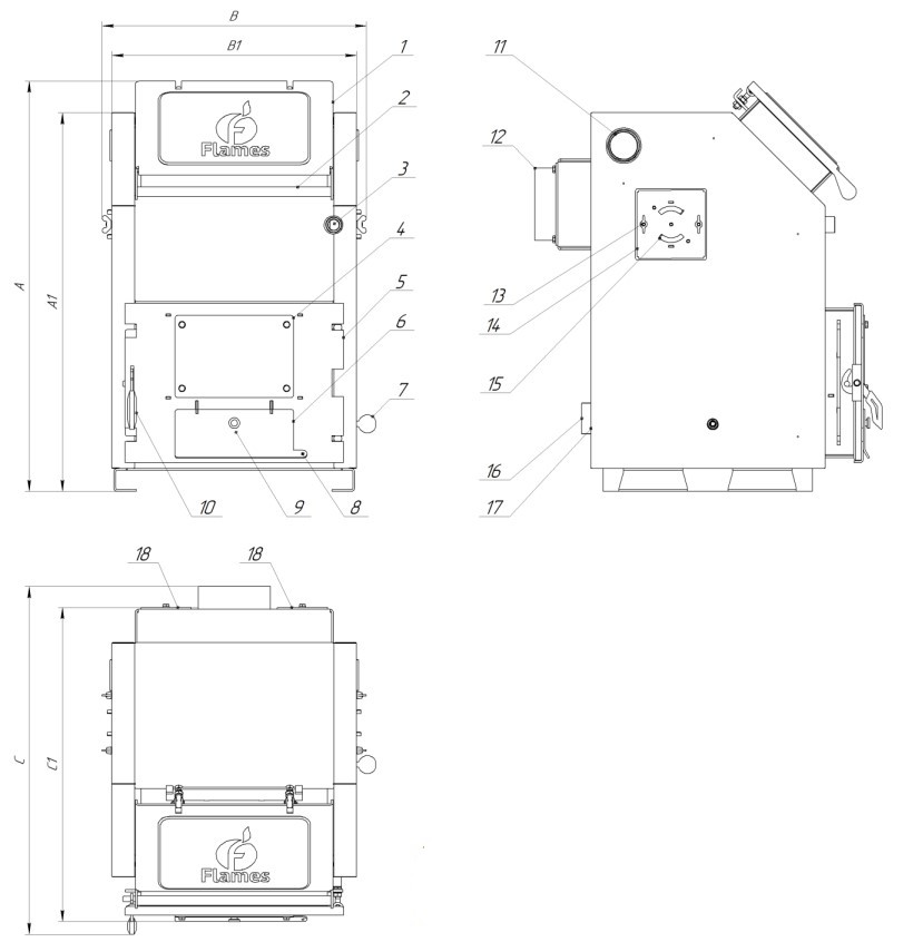 1 – Дверь закладки топлива, 2 – Ручка двери, 3 – Муфта Ду20 для установки регулятора горения, 4 – Заглушка (место установки горелки), 5 – Дверь топки, 6 – Заслонка подачи первичного воздуха, 7 – Ручка шуровки, 8 – Отверстие на заслонке для стыковки тросика регулятора горения, 9 – Ручка регулировки положения заслонки подачи первичного воздуха, 10 – Ручка двери, 11 – Муфта Ду50 для подключения прямой подачи теплоносителя (воды), с противоположной стороны аналогичное подключение (в одну из муфт возможна установка электрического нагревателя (ТЭН)), 12 – Дымовая труба дверца ревизии и укладки топлива, 13 – Гайка-барашек вторичного воздуховода, 14 – Вторичный воздуховод, 15 – Ручка регулировки вторичного воздуха, 16 – Муфта Ду50 для подключения обратной подачи теплоносителя (воды), 17 – Муфта Ду15 для установки крана подачи (слива) теплоносителя (воды), 18 – Заглушка ревизии переходной камеры, 19 – Затворник, 20 – Решетка, 21 – Зольник, 22 – Шуровка.