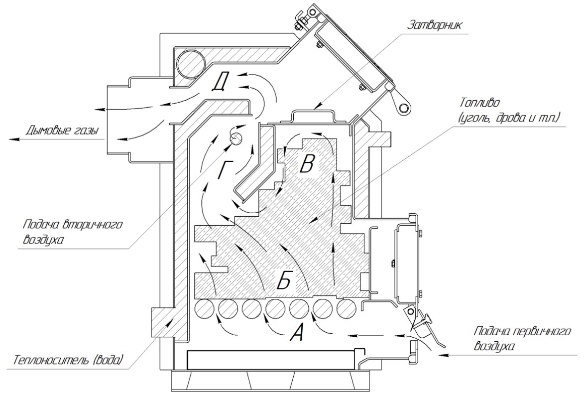 В зоне Г происходит основной процесс горения, куда через форсунки подается вторичный воздух для дожига летучих газов. Обеспечивается качественное перемешивание пиролизных газов и разогретого воздуха. После сгорания дымовые газы движутся по каналу Д и покидают котел.