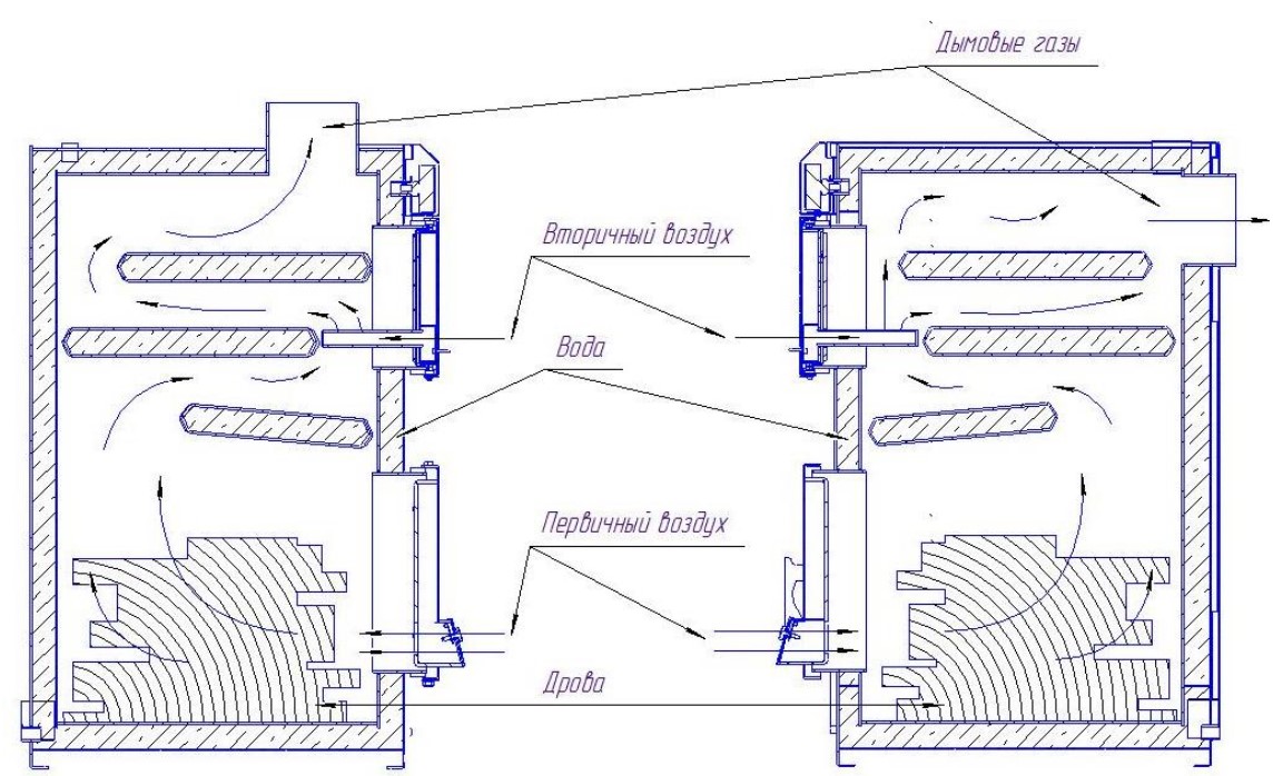 Образующиеся при нагреве дров пиролизные газы дожигаются системой подачи вторичного воздуха, что обеспечивает экологически чистое сгорание с минимальной золой.