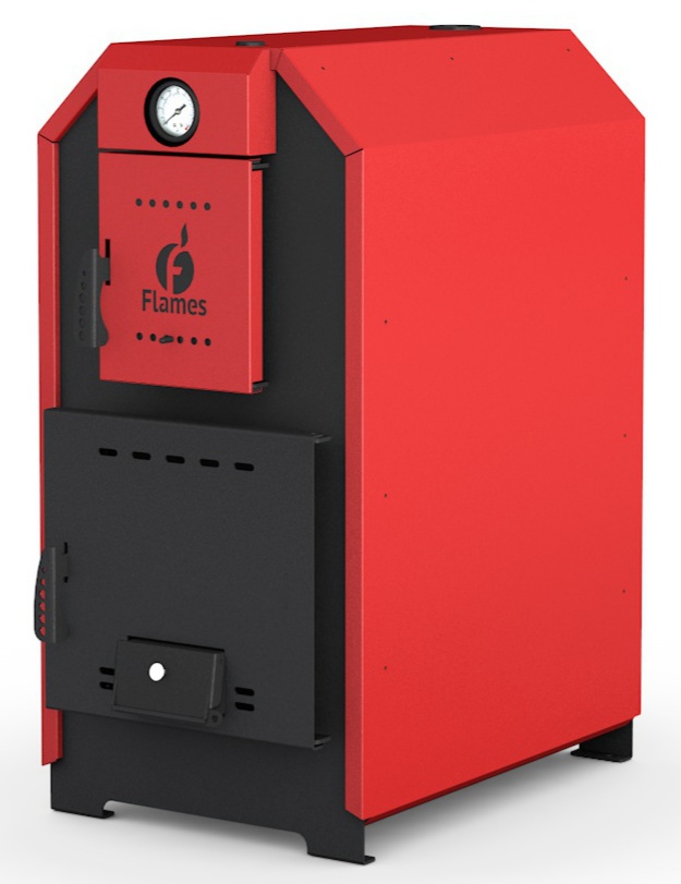 Твердотопливный котел Flames Green КОД 25ГТ с подовой (глухой) топкой устанавливается в системах водяного отопления жилых зданий. Основной вид топлива — дрова (до 55 см) или топливные брикеты. Изготовлен из стали марки 09Г2С. Толщина топки — 4 мм. Дымовая труба расположенна в горизонтальном направлении. Котел поддерживает комфортную температуру в доме до 12 часов. Регулируется как ручным способом, так и автоматическим регулятором тяги (опция).