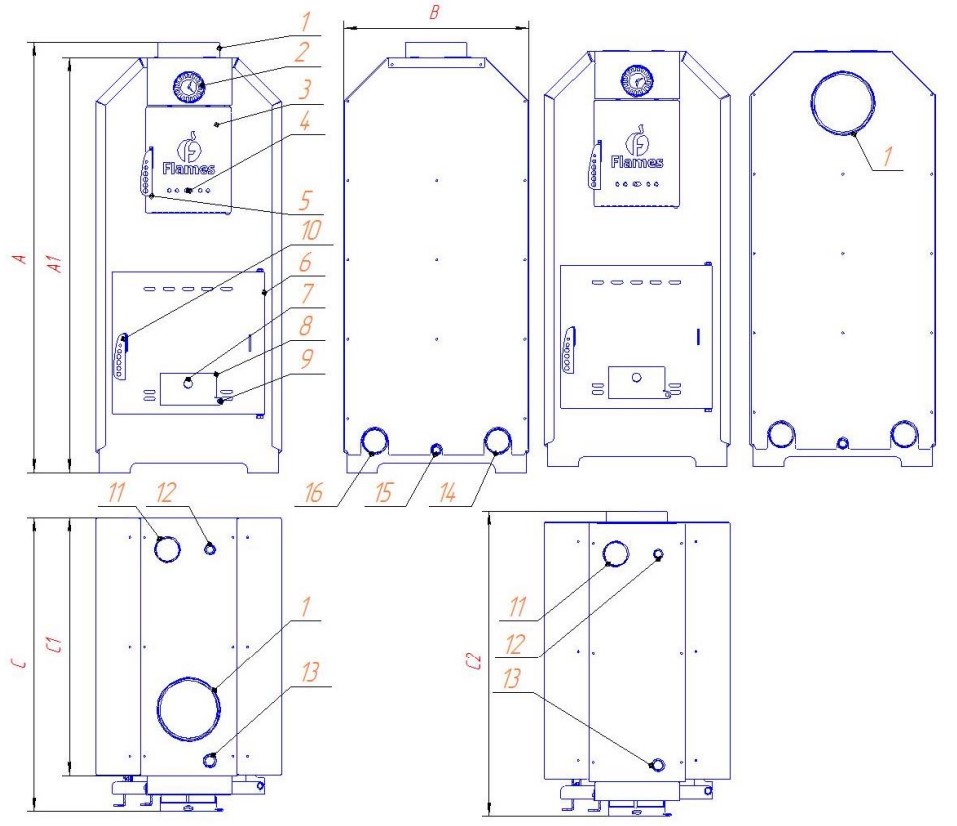 1 – Дымовая труба, 2 – Термоманометр стрелочный, 3 – Дверца ревизии, 4 – Ручка регулировки подачи вторичного воздуха, 5 – Ручка дверцы ревизии, 6 – Дверца топки, 7 – Фиксатор положения заслонки первичного воздуха, 8 – Заслонка первичного воздуха, 9 – Отверстие на заслонке для подстыковки тросика регулятора горения, 10 – Ручка дверцы топки, 11 – Муфта Ду50 для подключения прямой подачи теплоносителя (воды), может находиться с сзади верху в зависимости от типа котла, 12 – Муфта Ду15 для установки предохранительного клапана (группы безопасности), может находиться с сзади верху в зависимости от типа котла, 13 – Муфта Ду20 для установки регулятора горения, 14 – Муфта Ду50 для подключения обратной подачи теплоносителя (воды), 15 – Муфта Ду15 для подключения слива теплоносителя (воды), 16 – Муфта Ду50/32 для подключения обратной подачи теплоносителя (воды) – возможна установка ТЭН.