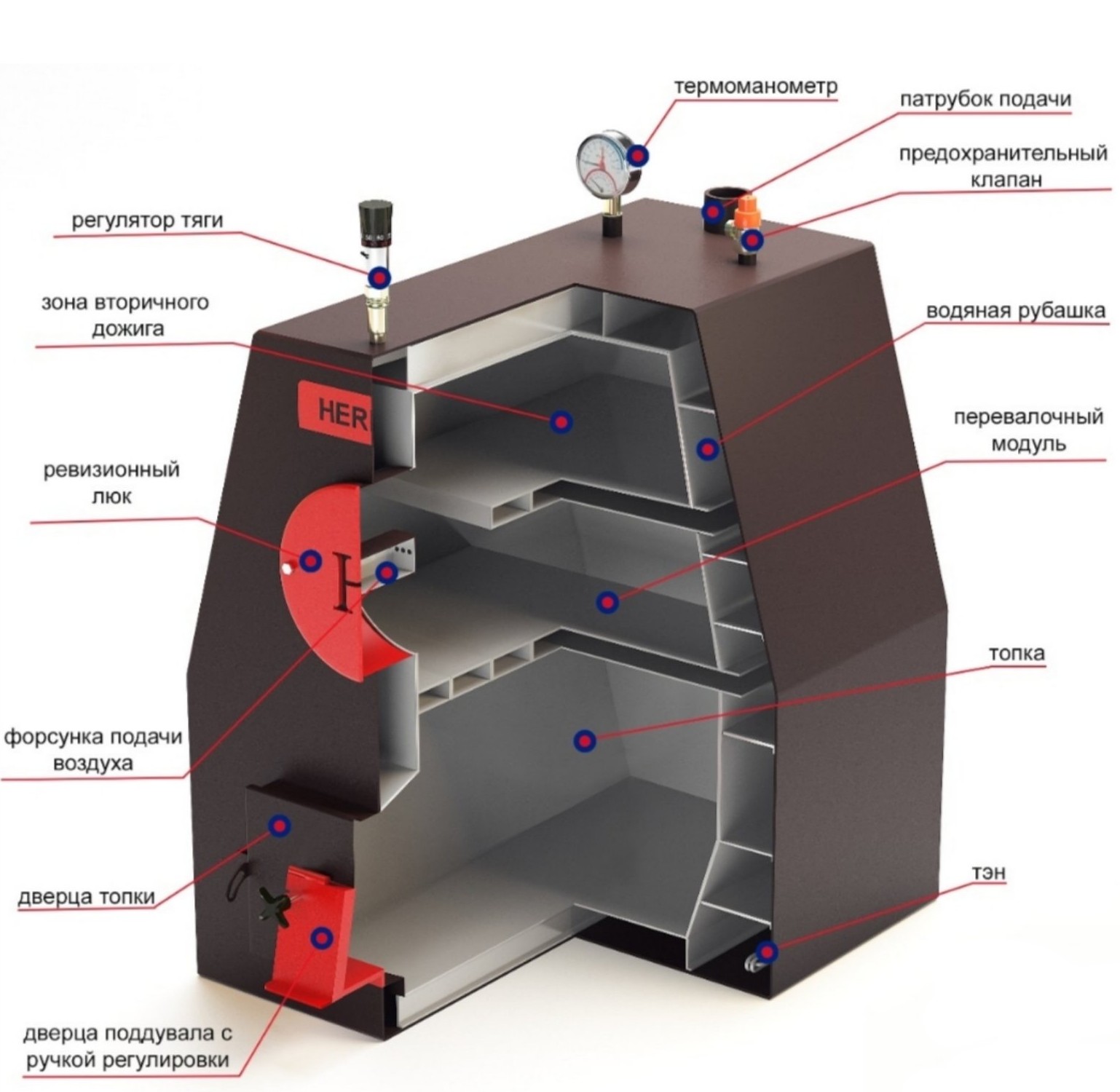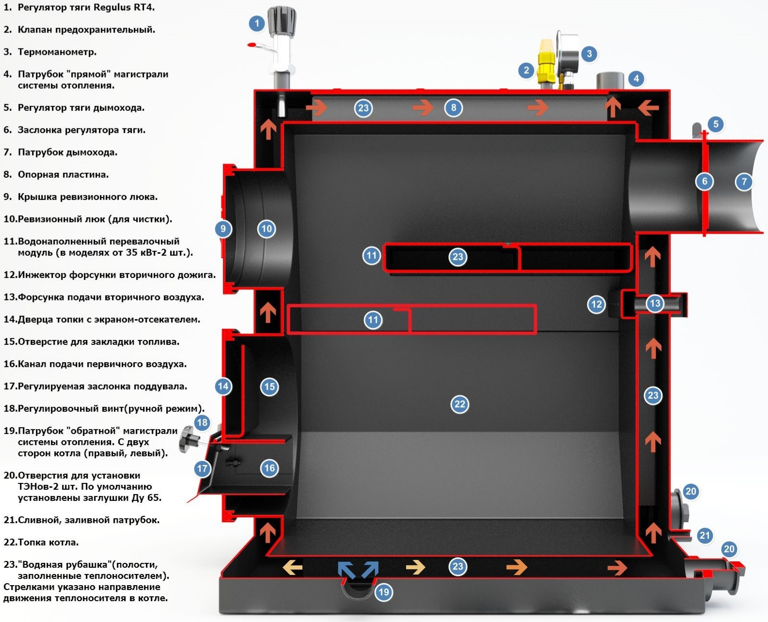- Долговечность: котловая сталь 09Г2С и омываемая водой топка гарантируют надёжную и безопасную эксплуатацию на протяжении многих лет.