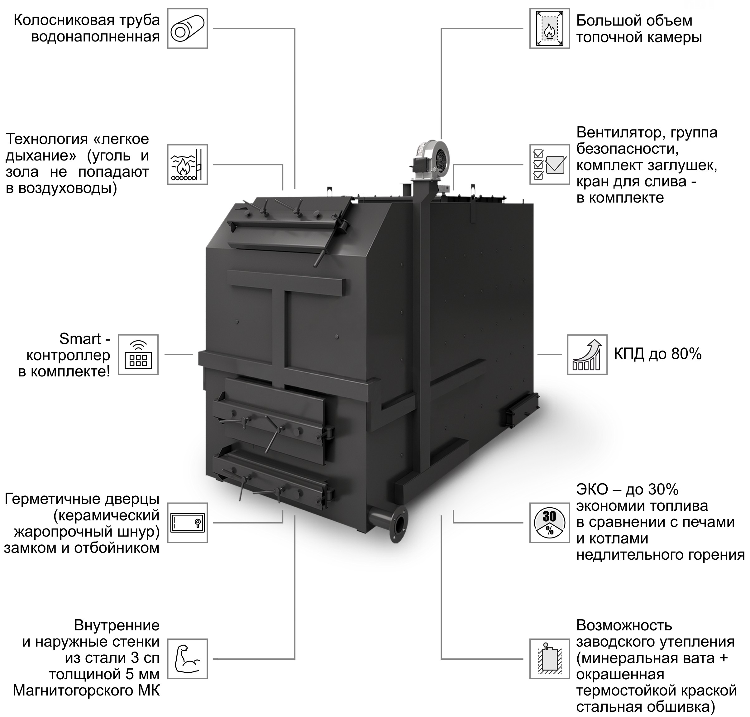 Температуру подачи теплоносителя можно регулировать в диапазоне 38–80 °C. Удобные люки для загрузки топлива, выгрузки золы и чистки теплообменника обеспечивают простоту обслуживания: при использовании качественного угля чистку теплообменника достаточно проводить 1–2 раза за отопительный сезон. Котёл работает круглосуточно, а после полного сгорания топлива на микропроцессоре загорается кнопка Стоп — после чего достаточно открыть нижнюю дверь и убрать золу с колосниковой решётки.