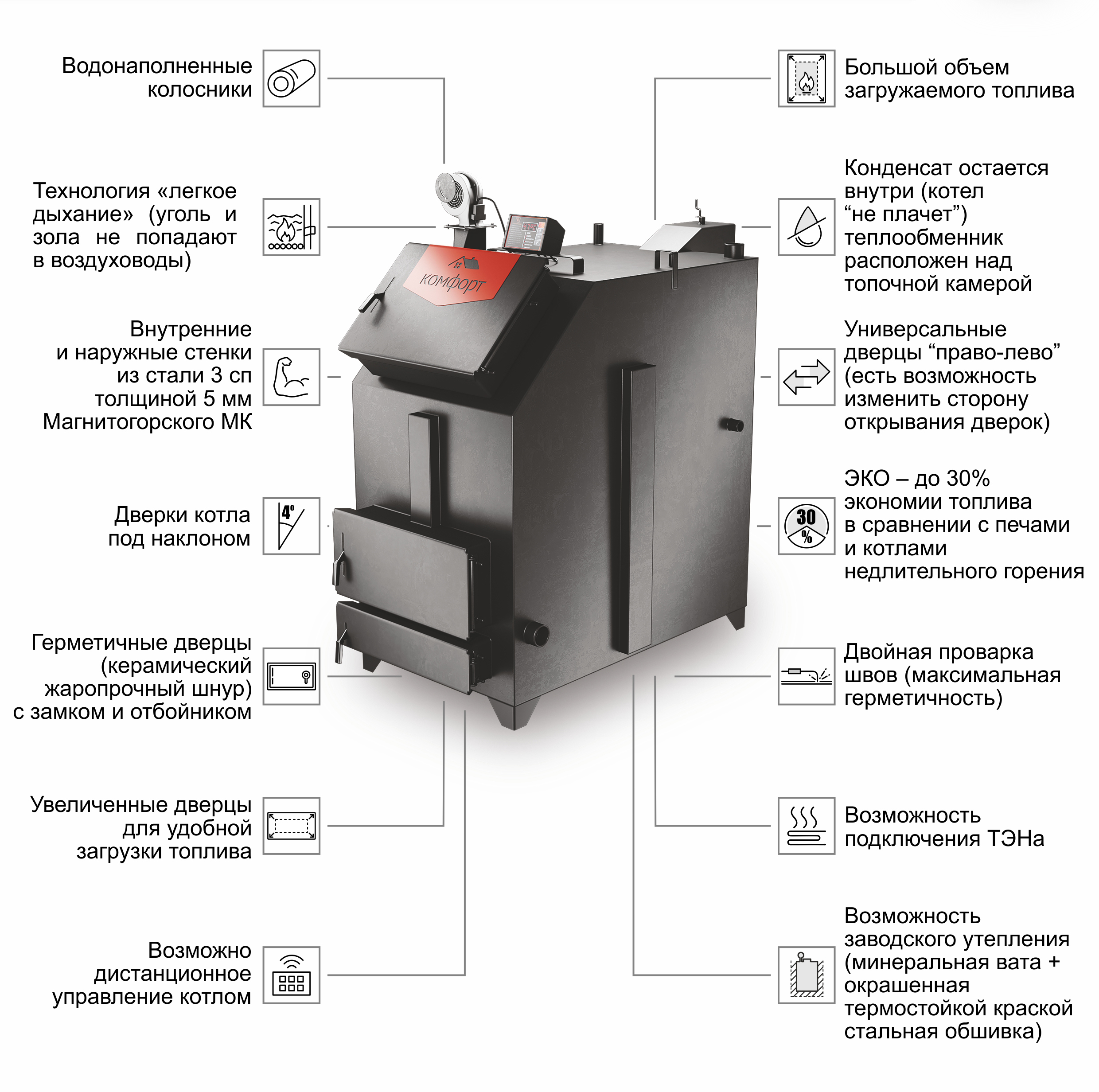 Котел твердотопливный длительного горения Комфорт Практик 20кВт предназначен для отопления индивидуальных жилых домов и производственных помещений общей площадью до 150 м². Изготовлен из прочной стали Ст3сп толщиной 5 мм, оснащён горизонтальным теплообменником (что исключает образование конденсата снаружи) и инновационной системой воздуховодов и форсунок «Лёгкое дыхание» (форсунки расположены под наклоном к топке, что не позволяет продуктам горения их «забивать», котлу легче дышится).