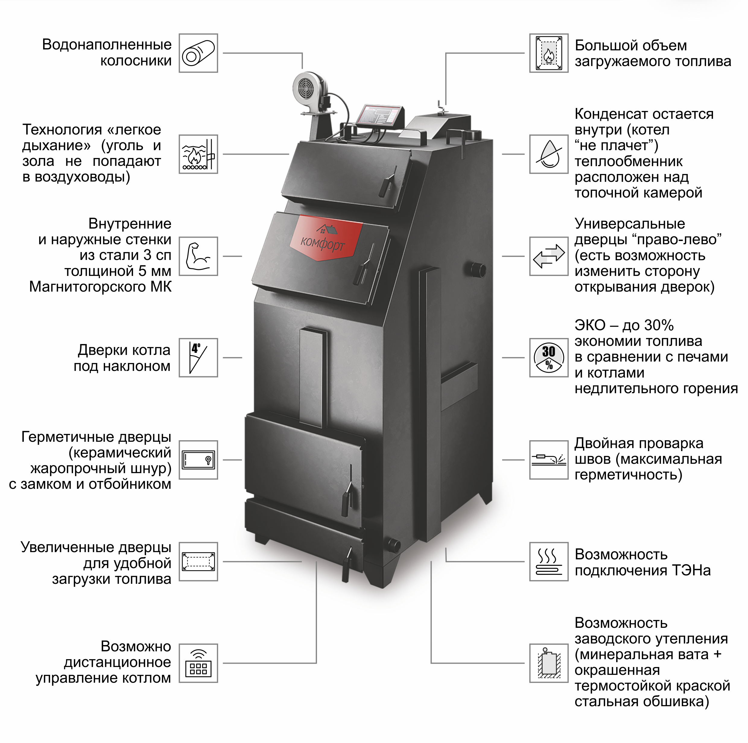 Работает на угле, дровах, отходах деревообработки и топливных брикетах, обеспечивая длительное горение на одной загрузке (5‑7 суток) и экономию топлива до 20‑30 % по сравнению с обычными котлами. В комплект входит smart‑контроллер ReglerPRO с Wi‑Fi для управления через Telegram, вентилятор и предохранительный клапан. Котел можно подключать к системе отопления с любой стороны, а дверцы легко перевесить самостоятельно для открывания влево или вправо.