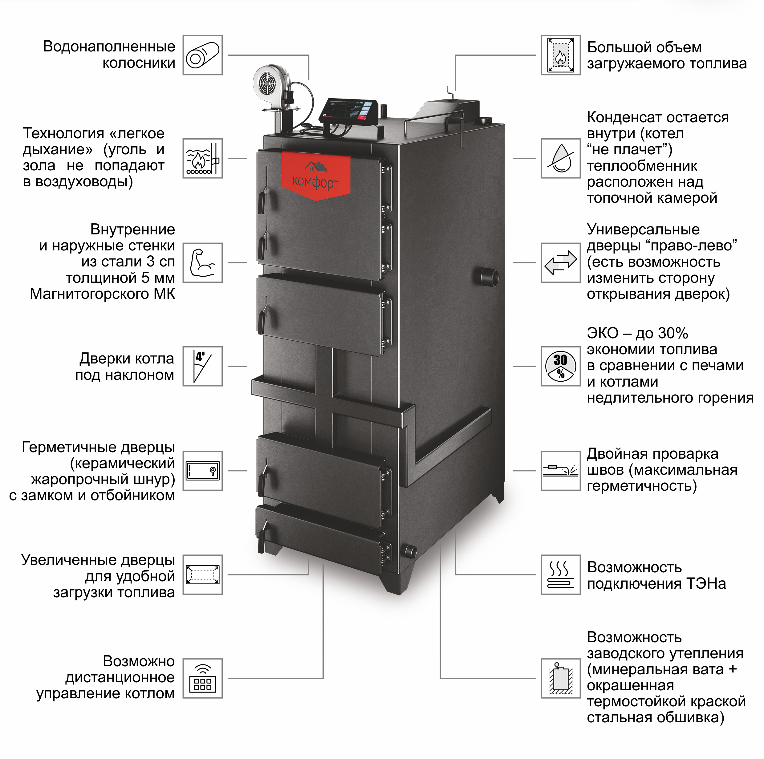 Работает на угле, дровах, отходах деревообработки и топливных брикетах, обеспечивая длительное горение на одной загрузке (5‑7 суток) и экономию топлива до 20‑30 % по сравнению с обычными котлами. В комплект входит smart‑контроллер ReglerPRO с Wi‑Fi для управления через Telegram, вентилятор и предохранительный клапан. Котел можно подключать к системе отопления с любой стороны, а дверцы легко перевесить самостоятельно для открывания влево или вправо.