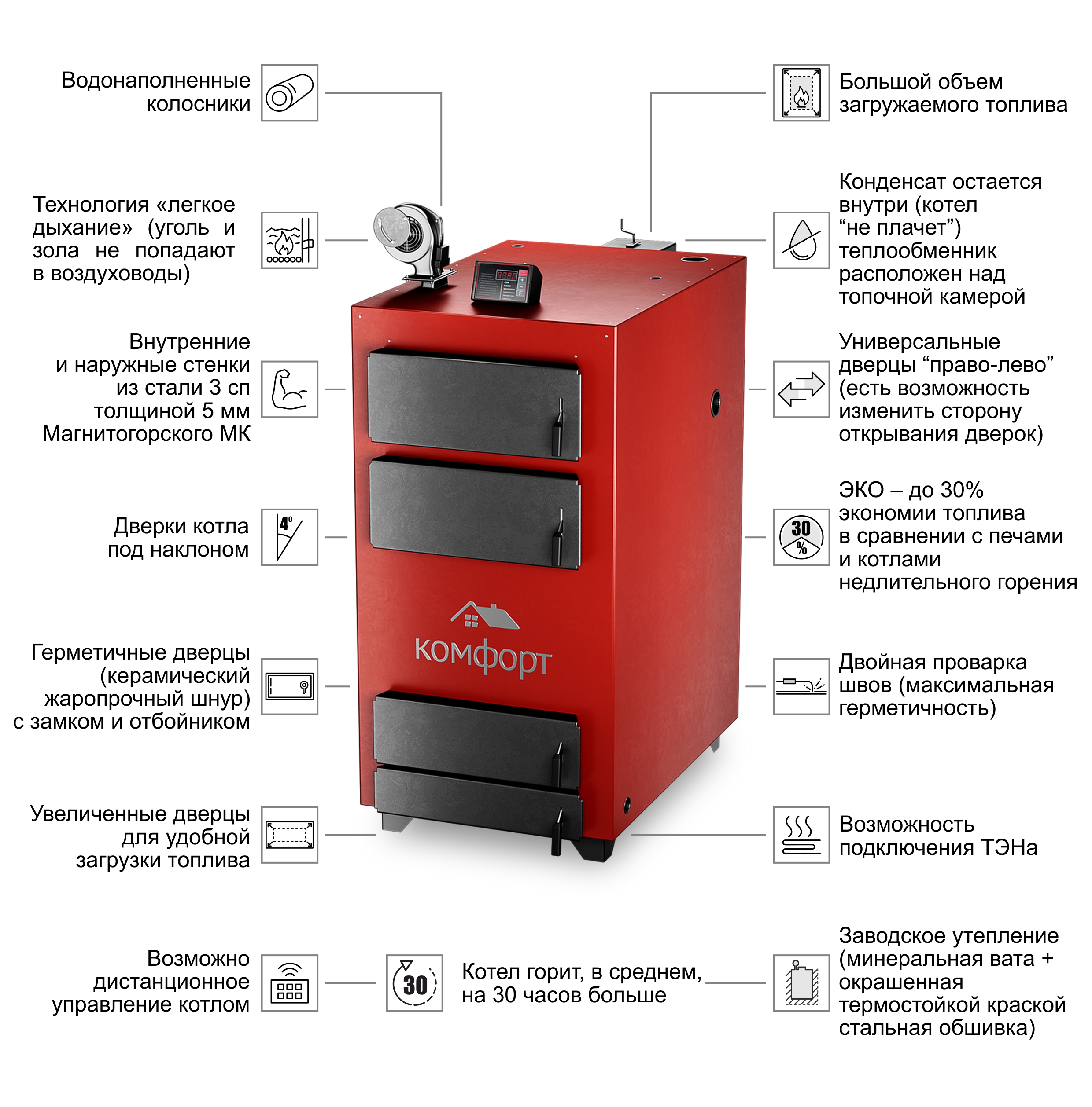 Работает на угле, дровах, отходах деревообработки и топливных брикетах, обеспечивая длительное горение на одной загрузке (5‑7 суток) и экономию топлива до 20‑30 % по сравнению с обычными котлами. В комплект входит smart‑контроллер ReglerPRO с Wi‑Fi для управления через Telegram, вентилятор и предохранительный клапан. Котел можно подключать к системе отопления с любой стороны, а дверцы легко перевесить самостоятельно для открывания влево или вправо.