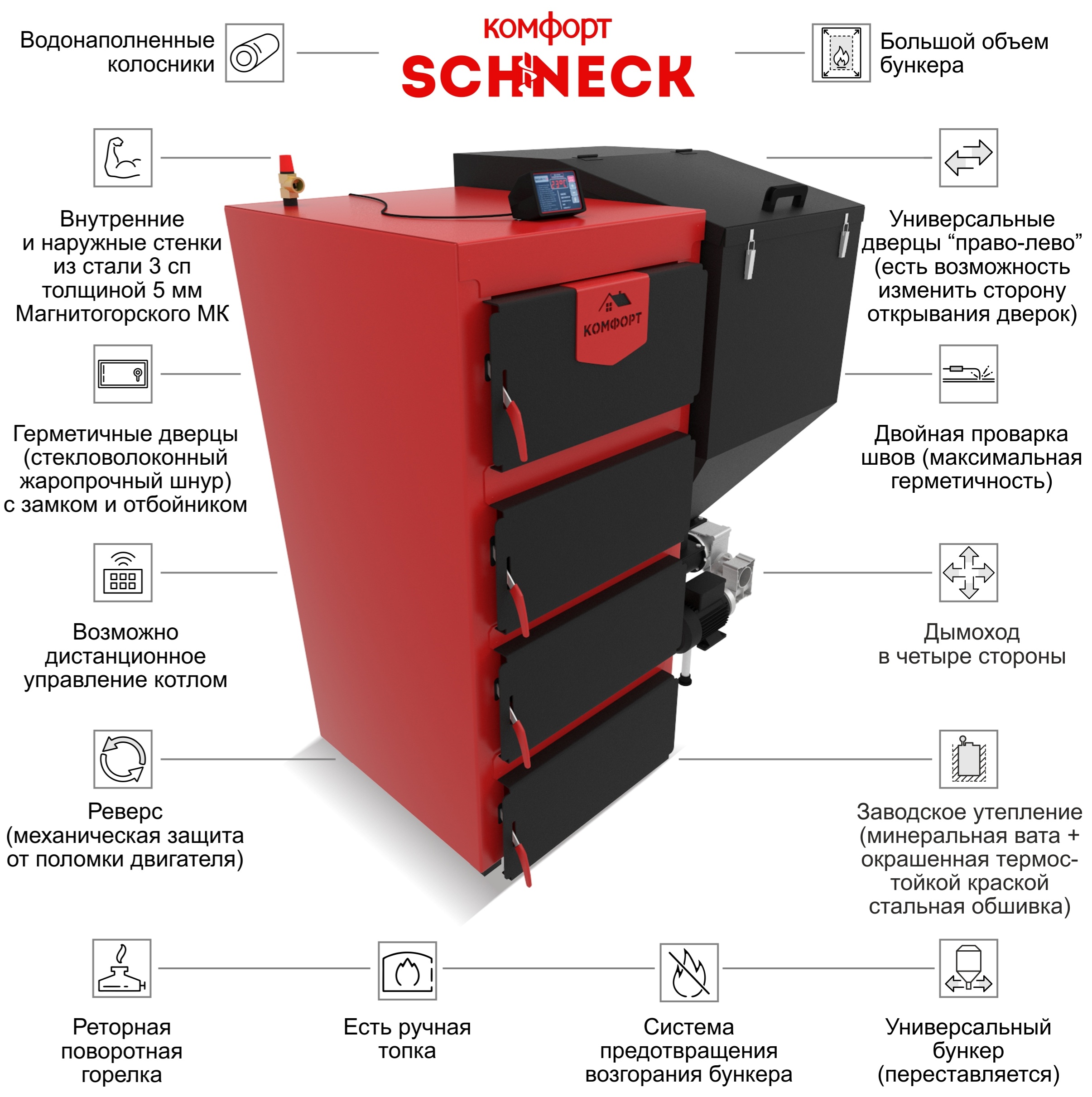 - Большой универсальный бункер — возможность перестановки и защита от возгорания с датчиком ТермоСтраж.