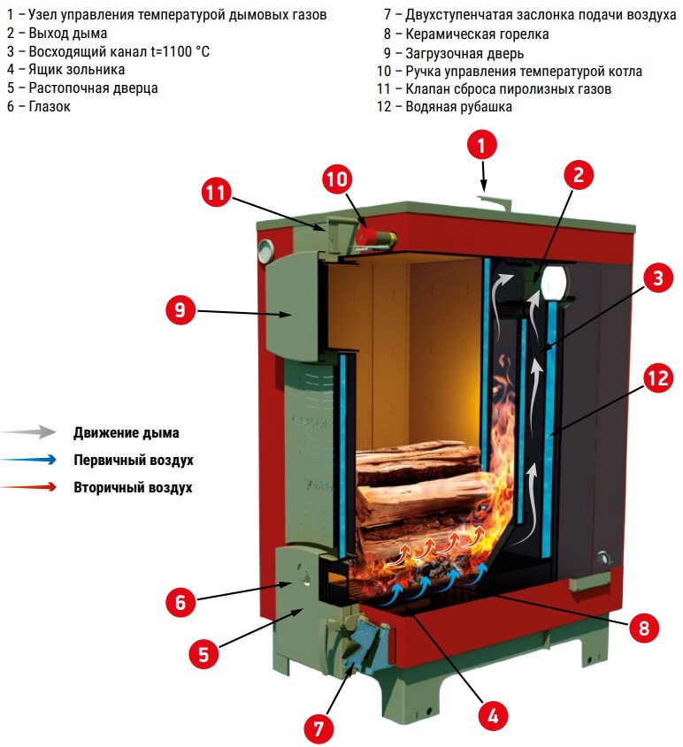 - теплоизоляция части газового тракта в зоне высоких температур и дожигание в ней (с помощью нагретого вторичного воздуха) пиролизных газов, а также летучих компонентов топлива в жидкой и твёрдой фазе. За счёт этого температура в восходящем канале может увеличиваться до 1200℃. Высокоэффективное сжигание компонентов топлива в жидкой и твёрдой фазах на мощностях выше средней существенно уменьшает рост отложений на теплообменных поверхностях, что увеличивает период между чистками котла;