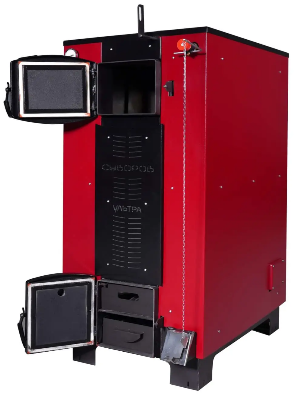 Твердотопливный котёл длительного горения «Суворов Ультра» К-8У предназначен для отопления частных домов, дач и небольших коммерческих помещений площадью до 120 м². Работает на дровах, угле и топливных брикетах. Для увеличения срока службы, особенно в неблагоприятных условиях эксплуатации, внутренние стенки рубашки выполнены из котловой стали толщиной 5 мм. При этом топка выполнена достаточно объёмной и в неё можно закладывать дрова большой длины. В качестве дополнительной опции предусмотрена возможность оснащения котла контуром ГВС из нержавеющей стали и ТЭНом. В котел «Суворов Ультра» внесен целый ряд новых инновационных решений, позволяющих значительно улучшить его технические и эксплуатационные характеристики, а также реализовать не имеющие аналогов функции.