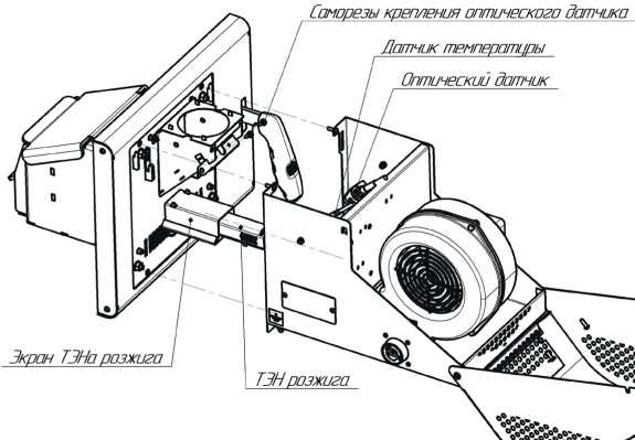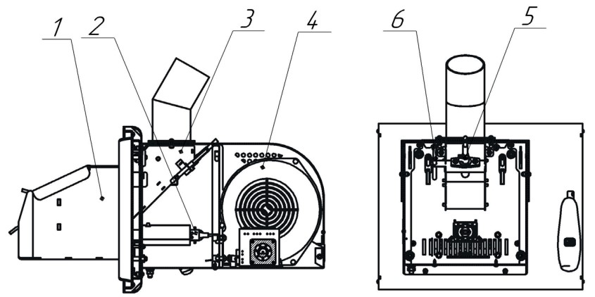 Горелочное устройство состоит из жаровни (1), в которой происходит автоматический розжиг и горение пеллет; ТЭНа розжига (2), который производит розжиг пеллет; подающего лотка (3) с патрубком подачи, посредством которых происходит подача пеллет из бункера в жаровню; вентилятора (4), который в зависимости от заданных параметров, подает требуемое количество воздуха для горения пеллет; оптического датчика пламени (5), который предназначен для определения наличия пламени в жаровне; датчика температуры лотка (датчик температуры шнека подачи) (6), контролирующего температуру в корпусе горелочного устройства.