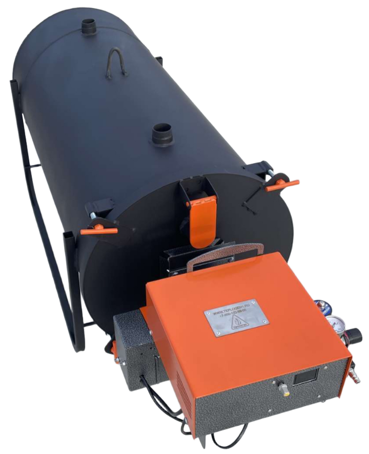 В топку котла монтируется горелка, вокруг горелки находится «рубашка» с теплоносителем. По команде внешнего термостата (каппилярного или другого) на электросхемы горелки подается питание. Штатный термостат может быть заменен и/или дополнен другим терморегулирующим устройством: комнатным термостатом, WiFi или GSM термостатом и тд. и тп. Сначала масло подогревается в маслобаке до установленной температуры, топливо в бак подается специальным маслонасом.