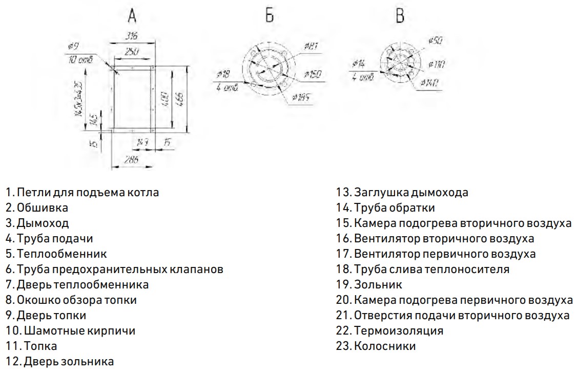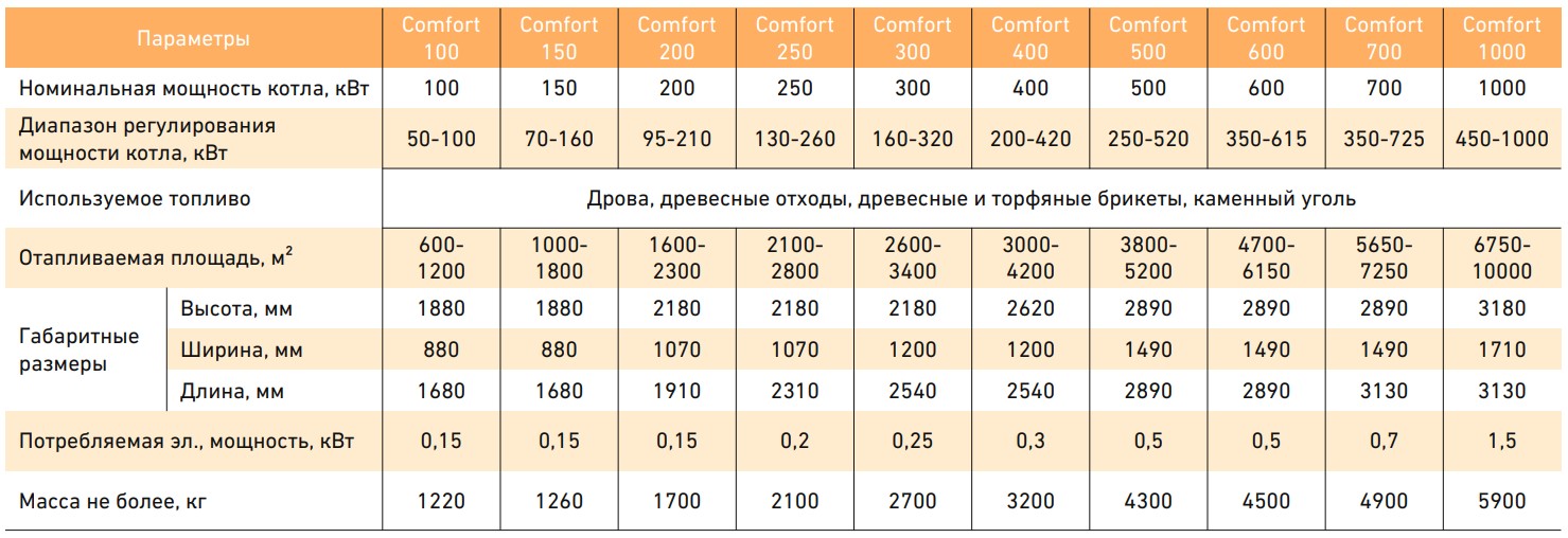 | Основное топливо | Уголь, Дрова, Топливные брикеты, Древесные отходы, Торф |