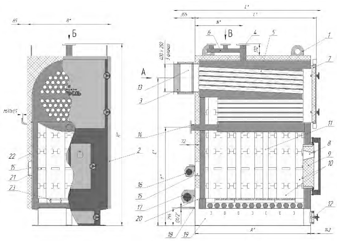 - Котёл сварен из листов конструкционной низколегированной стали 09Г2С толщиной 5 мм и труб D57, D76 мм, изолирован слоем минеральной ваты толщиной 50 мм.
