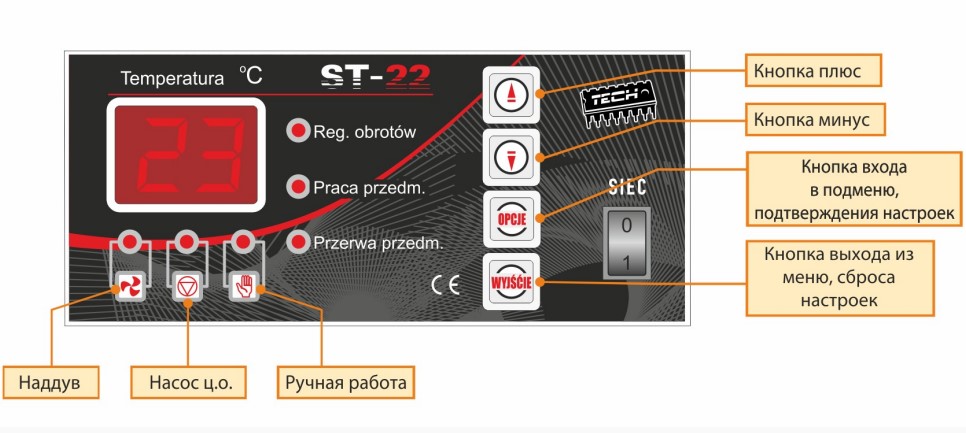 Контроллер ST-22N управляет подачей воздуха с помощью дутьевого вентилятора, который, в свою очередь, в автоматическом режиме за счёт отключения и включения поддерживает постоянную температуру теплоносителя в системе отопления. Также данная автоматика позволяет поддерживать климат в помещении в более стабильном температурном режиме, увеличивает длительность горения от 10 до 20% и как следствие — экономит топливо! При установке модуля автоматики в системе отопления должен быть установлен циркуляционный насос.