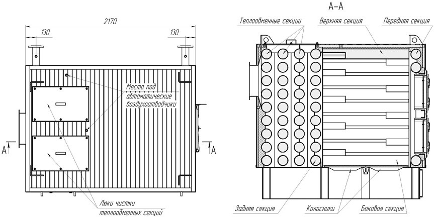 - Теплообменник собран из теплообменных секций, по трубам которых циркулирует теплоноситель.