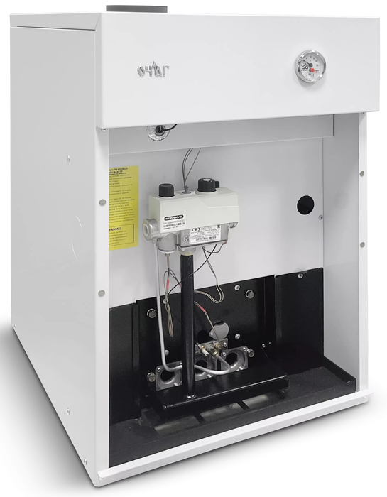 Стабилизатор тяги выравнивает давление воздуха в топке котла, обеспечивая устойчивое горение газовоздушной смеси без дополнительных регулировок, а также исключает задувание запальной горелки при кратковременном опрокидывании тяги. Основные горелки размещены равномерно под теплообменником, создавая равномерное тепловое поле в топочном объёме, что исключает образование локальных зон перегрева теплообменника.