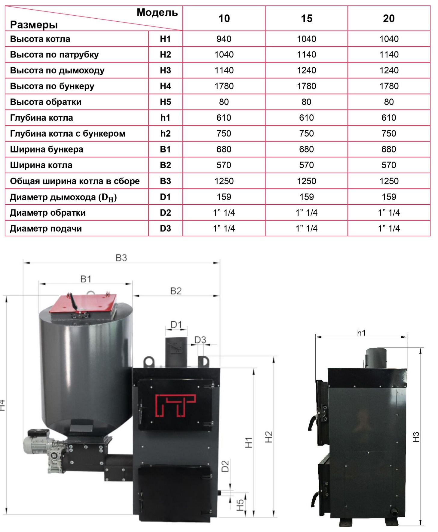 Размеры котлов ПТ мощностью 10-20 кВт:
