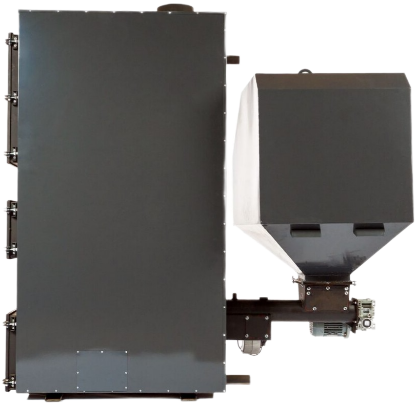- Возможность установки дополнительных опций: автоматическое золоудаление (шнековое/нижнее), контроллер с функцией GSM, увеличенный топливный бункер, конвейерная подача топлива для бункера и др.