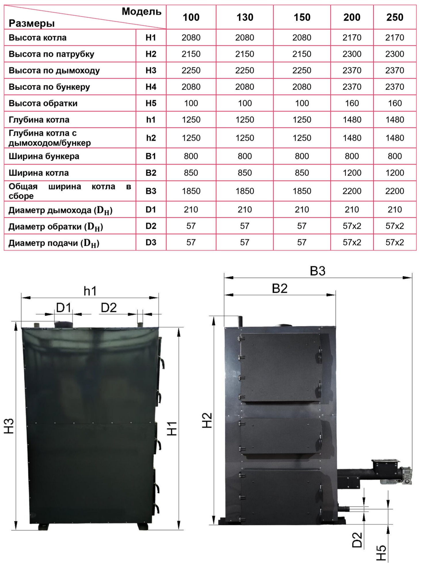 Размеры котлов ПТ мощностью 100-250 кВт: