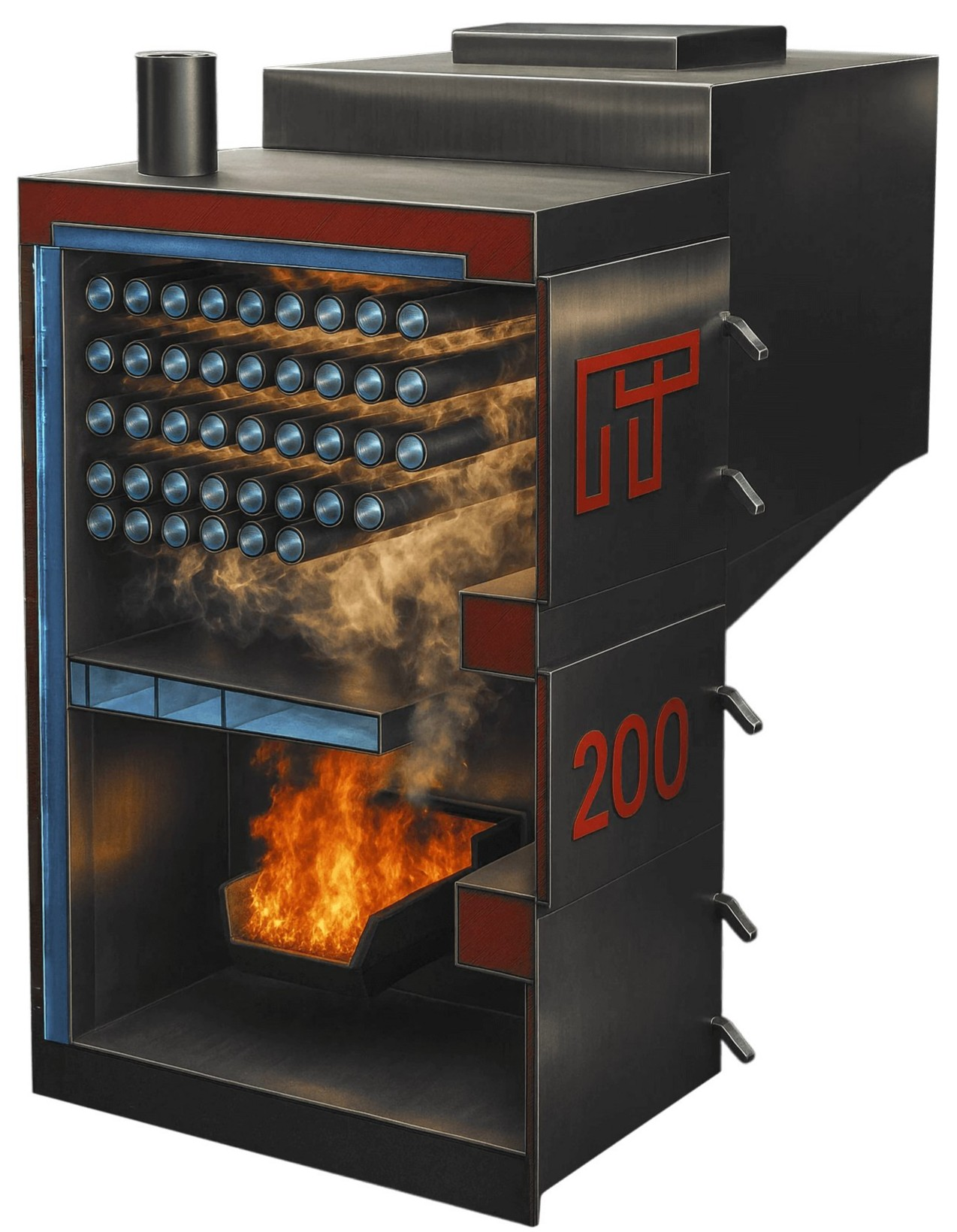- Современные технологии сжигания: горелка эффективного сжигания из нержавеющей стали обеспечивает полное и равномерное сжигание бурого угля, минимизирует образование шлака и снижает необходимость частого обслуживания;