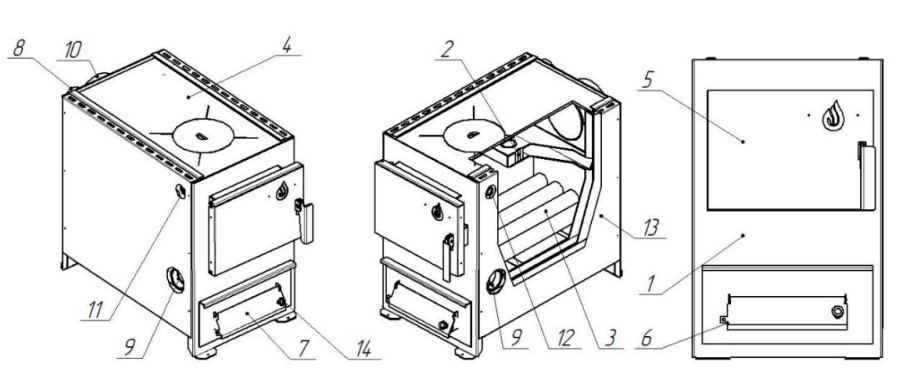 1 – Корпус котла, 2 – Водонаполненный пламяотбойник, 3 – Водонаполненный колосник, 4 – Варочная плита с конфоркой, 5 – Топочная дверца, 6 – Зольный ящик, 7 – Дверца подачи первичного воздуха, 8 – Патрубок подающей линии, 9 – Патрубок обратной линии, а также место установки блока ТЭНов, 10 – Патрубок дымохода, 11 – Патрубок регулятора тяги, 12 – Биметаллический термометр, 13 – Защитнодекоративные панели, 14 – Ручка регулировки поднятия заслонки.