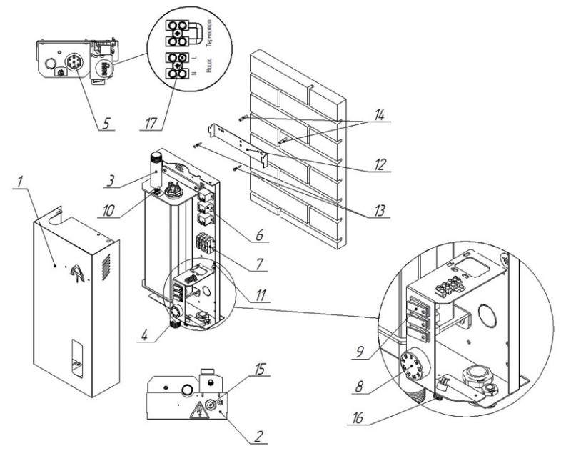 1 — Кожух котла, 2 — Корпус котла, 3 — Патрубок выхода теплоносителя, 4 — Патрубок входа теплоносителя, 5 — Блок нагревательных элементов (ТЭН), 6 — Электромеханические коммутационные реле, 7 — Клеммы подключения силового кабеля, 8 — Ручка термостата, 9 — Переключатели ступеней мощности, 10 — Датчик перегрева теплоносителя, 11 — Болт заземления, 12 — Кронштейн настенный, 13 — Шуруп для крепления кронштейна к стене, 14 — Дюбель пластмассовый, 15 — Сальники для ввода и вывода кабелей, 16 — Предохранитель цепей управления (2А), 17 — Колодка для подключения насоса и термостата.