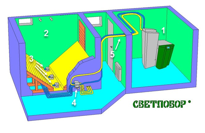 Система состоит из пеллетного котла Светлобор (1) и внешнего склада пеллет (2), где установлены заборные устройства («Грибки» 3) и автоматический переключатель (4), соединенные вакуумными шлангами (5).