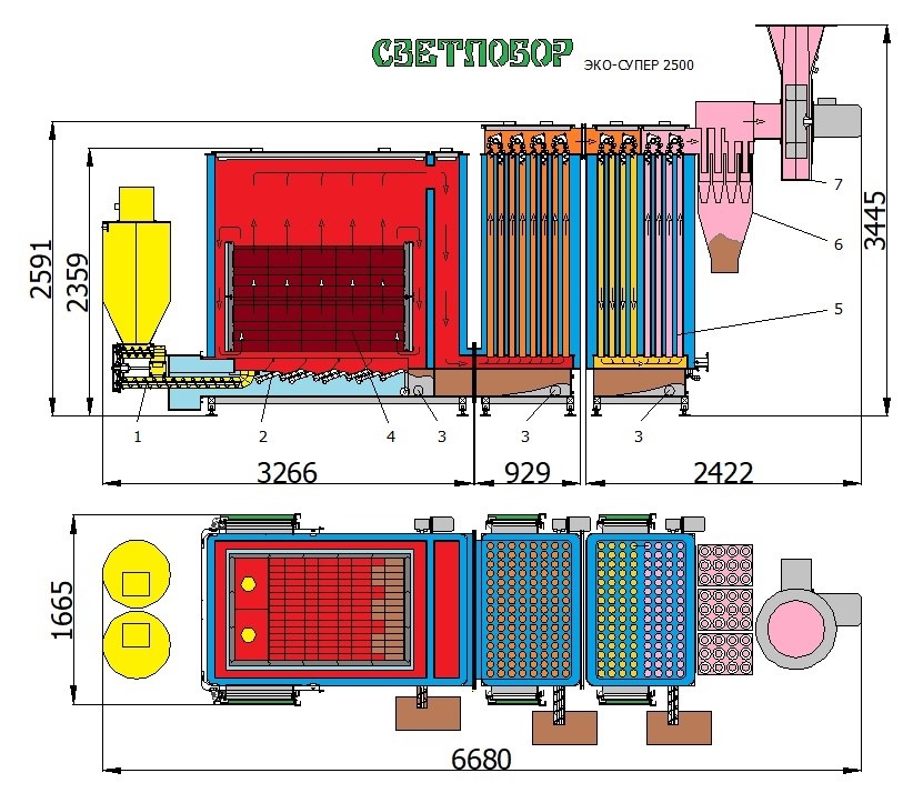 Промышленный автоматический пеллетный котёл Светлобор ЭКО-Супер 2500 — современное решение для автономного отопления производственных помещений, которое идеально подходит для промышленного использования. Он обеспечивает эффективное и экономичное отопление производственных цехов, складских комплексов, сельскохозяйственных объектов и других промышленных зданий до 25000 м². Работает на любых пеллетах (диаметром 6-8 мм), включая низкосортные серые из горбыля и лузги подсолнечника, а также на сухой щепе влажностью до 30%. Котёл оснащён автоматической очисткой колосниковой решетки, дымогарных труб при помощи подъёма/опускания спиралей, механизмом удаления золы. Cостоит из трех частей — топки и теплообменников №1 и №2. Все части имеют водяную рубашку. Автоматическая система подачи пеллет с внешнего склада в топку котла существует в двух вариантах — двойная вакуумная подача и шнековая подача.