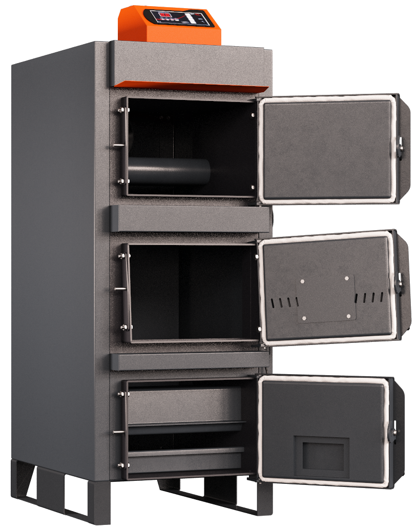 Тепловъ Smart Big Auto - это стальные водогрейные котлы с увеличенной топкой, работающие в полуавтоматическом режиме. На котёл устанавливается контроллер, который, исходя из установленных настроек, управляет подачей воздуха посредством вентилятора наддува.