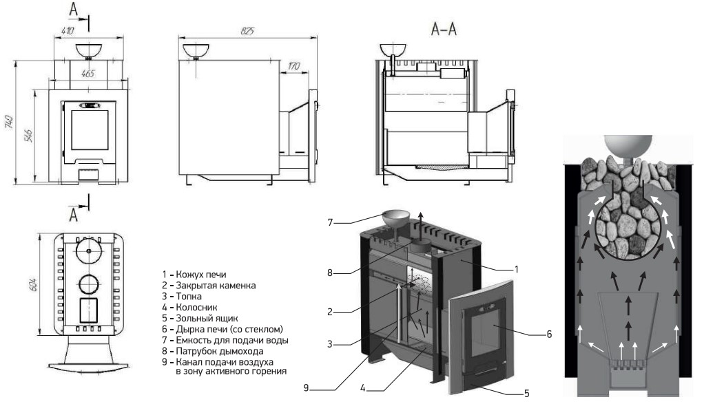 Главной конструктивной особенностью печи является наличие емкой закрытой каменки из нержавеющей стали, вмещающей 25 кг камней. Также, реализована эффективная схема подачи воздуха в зоны активного горения, что значительно увеличивает КПД печи.
